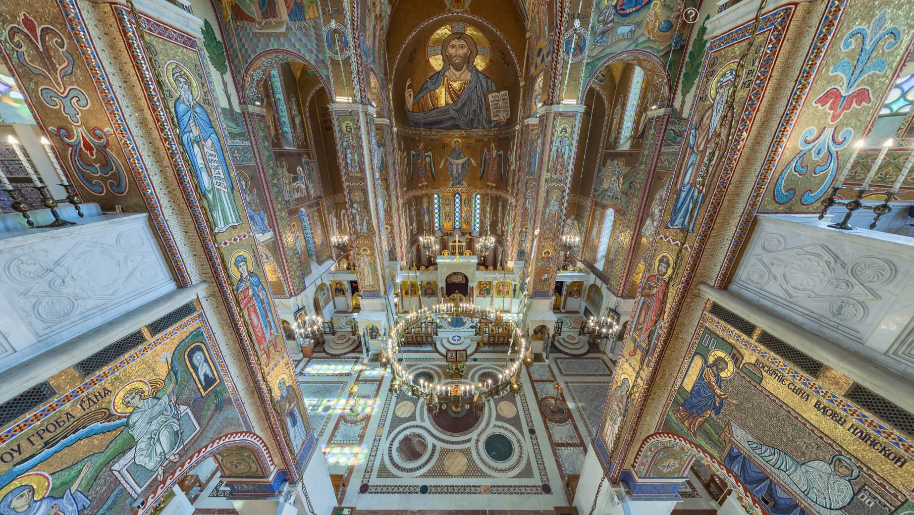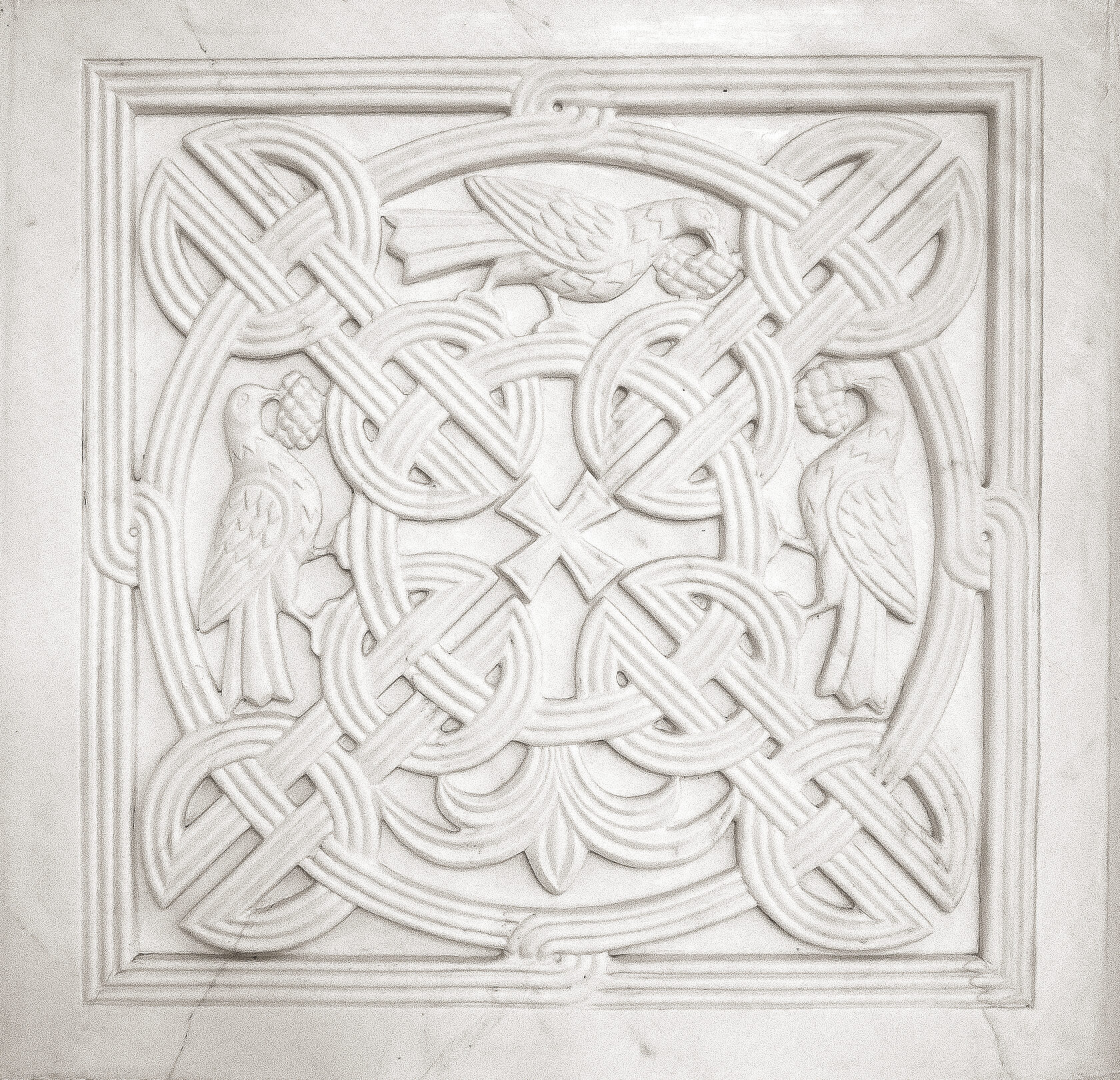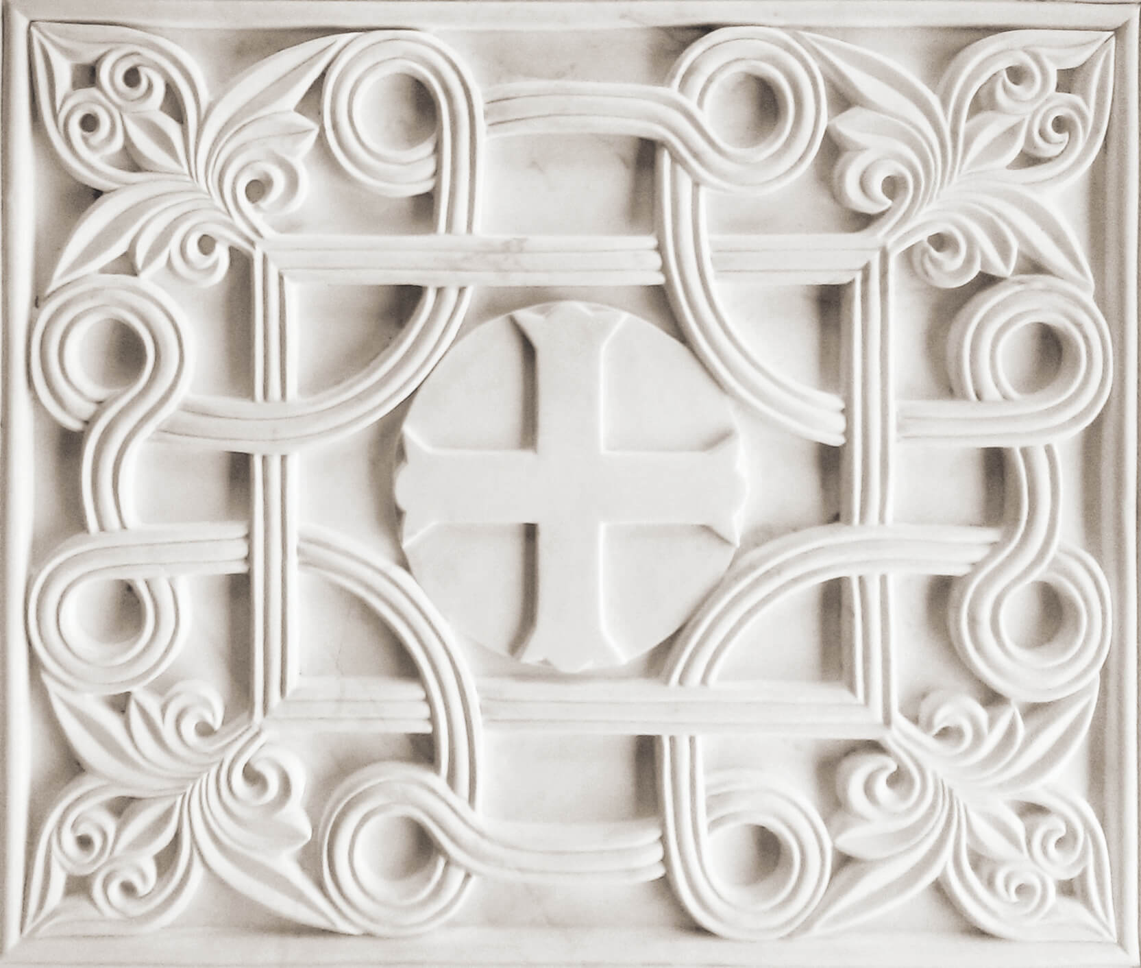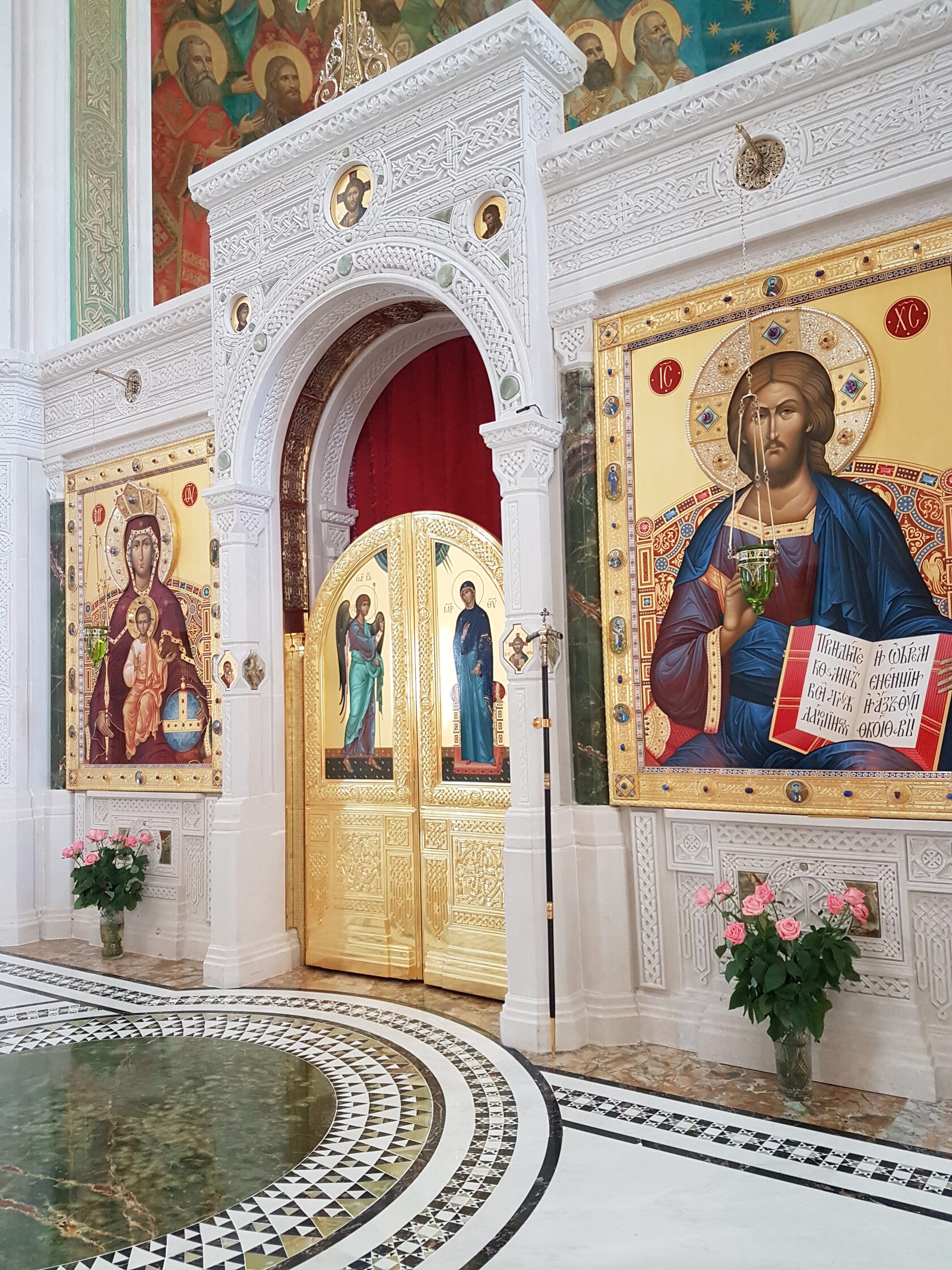 Одноярусная алтарная преграда заняла достойное место в интерьере, который мы выполнили в духе лучших образцов Византии. Она не высока, но довольно сложна и самобытна по композиции. Высокие прямоугольные порталы над Царскими вратами и местными иконами Спасителя и Богоматери делают иконостас основательным и динамичным. Резьба по камню и вставки мозаики придают ему нарядности. Цветные колонны оттеняют белизну мрамора Тассос, из которого изготовлена алтарная преграда.